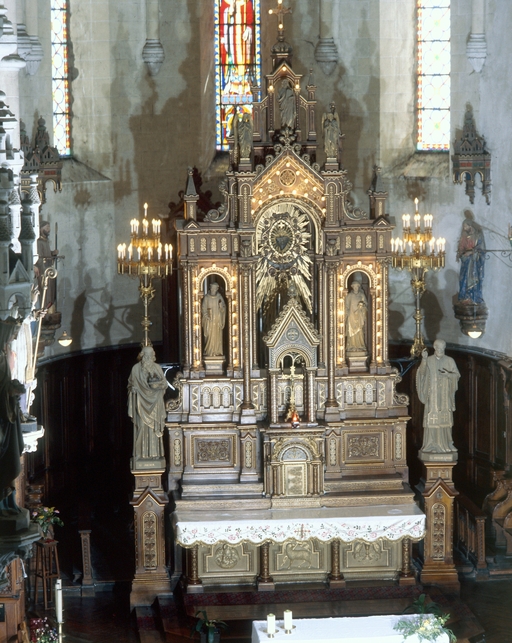 Autel, retable, tabernacle, gradins d'autel (2), exposition (maître-autel, tabernacle à ailes et dais d'exposition, retable architecturé à niche), église paroissiale Saint-Eloi (Saint-M'Hervé),