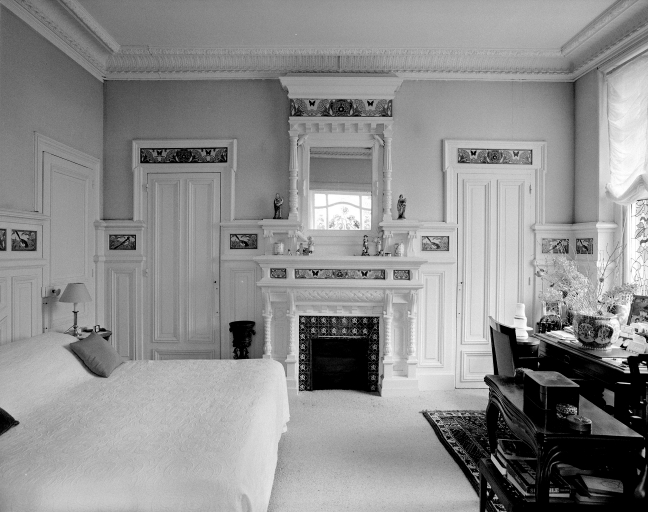 Vue générale de la cheminée du rez-de-chaussée avec céramique.Immatriculation