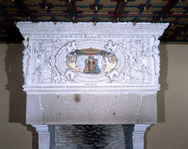 Vue de la partie haute de la cheminée sculptée.Immatriculation