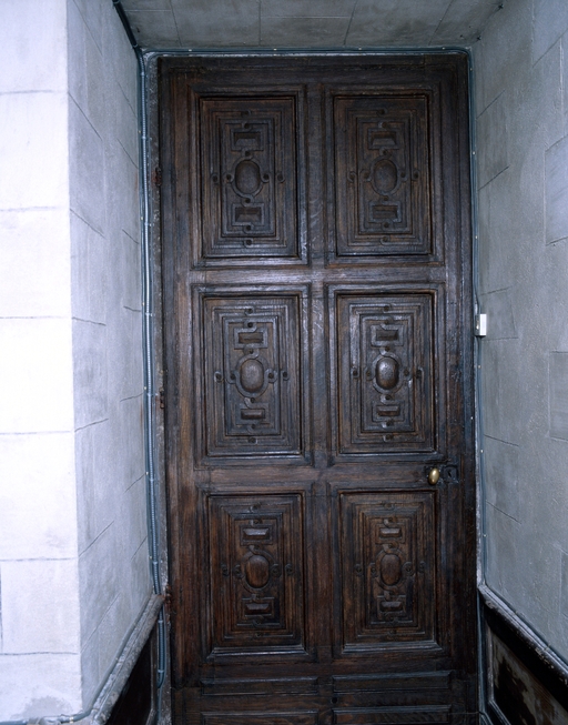 Vue générale de la porte intérieure en bois sculpté.Immatriculation