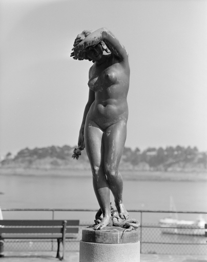 Terrasse extérieure, vue générale de la statue de Gaston Guitton.Immatriculation