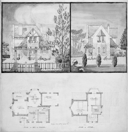 Projet de villa, variation du type B, élévation sur mer, élévation sur jardin, plan du rez-de-chaussée et plan de l'étage.Immatriculation