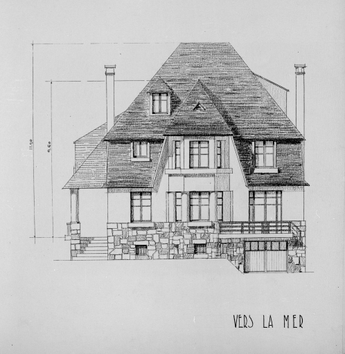 Projet de villa n°3, élévation de façade vers la mer.Immatriculation