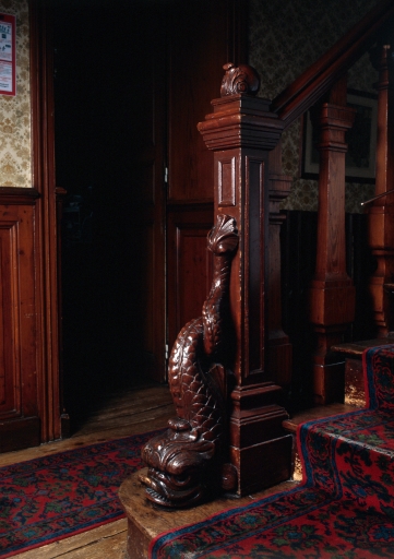 Rez-de-chaussée, 2ème escalier, plan de droite, départ de l'escalier avec poisson sculpté.Immatriculation