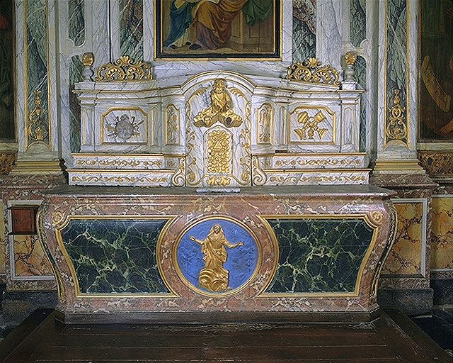 Ensemble de l'autel de la Vierge (autel, 2 gradins, retable, tabernacle, degré, bas-relief),