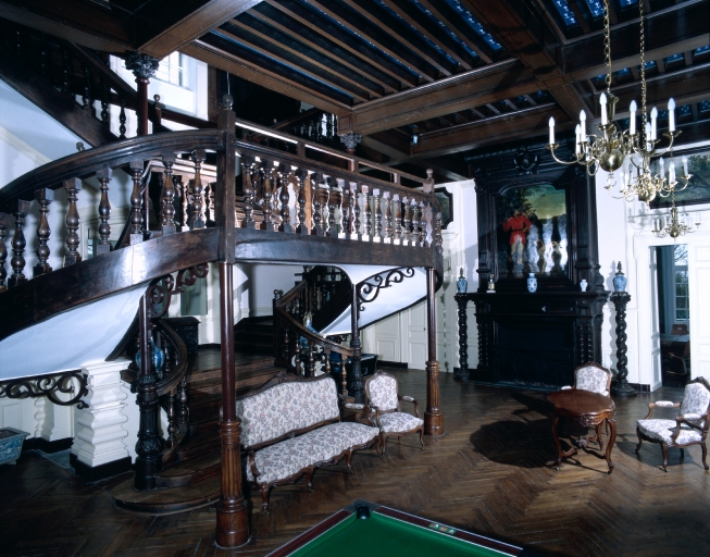 Vue générale intérieure du grand hall avec escalier.Immatriculation