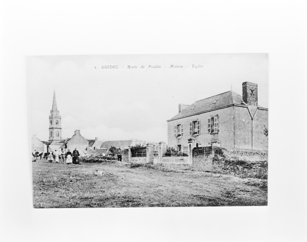 Guidel. Route de Pouldu. Maison, église.Immatriculation