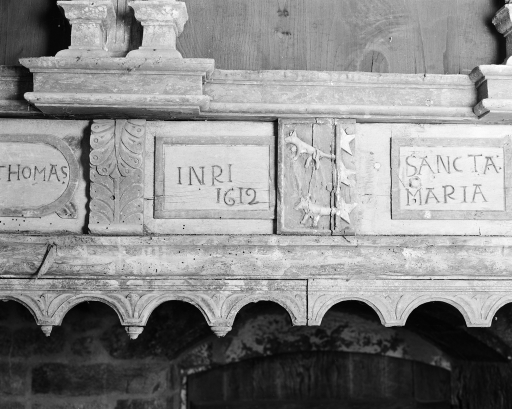 Détail de d'inscriptions 1612 et du blason.Immatriculation