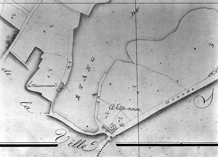 Plan cadastral 1807-1809. Section B2 : l'étang au Duc, partie sud, la Tête Noire et le départ de la route de Rennes. AM Vannes 21Fi.Immatriculation