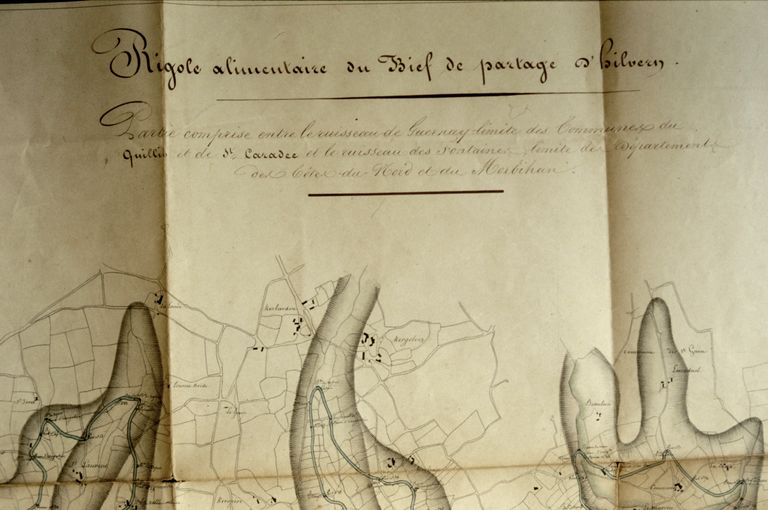 Rigole alimentaire du bief de partage d'Hilvern. Partie comprise entre le ruisseau de Guernay, limite des communes du Quillo et St-Caradec et le ruisseau des Fontaines, limite des départements des Côtes-du-Nord et du Morbihan. Carte [= carte 2], par Faivre, conducteur faisant office d'ingénieur ordinaire des Ponts et chaussées, 22 janvier 1844. Papier, encre.