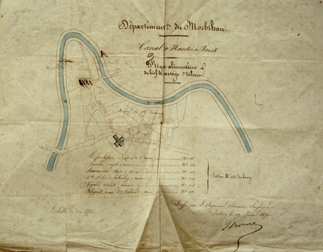 Département du Morbihan. Canal de Nantes à Brest. Rigole alimentaire du bief de partage d'Hilvern. Plan, par Faivre, ingénieur ordinaire des Ponts et Chaussées, 19 juin 1850.