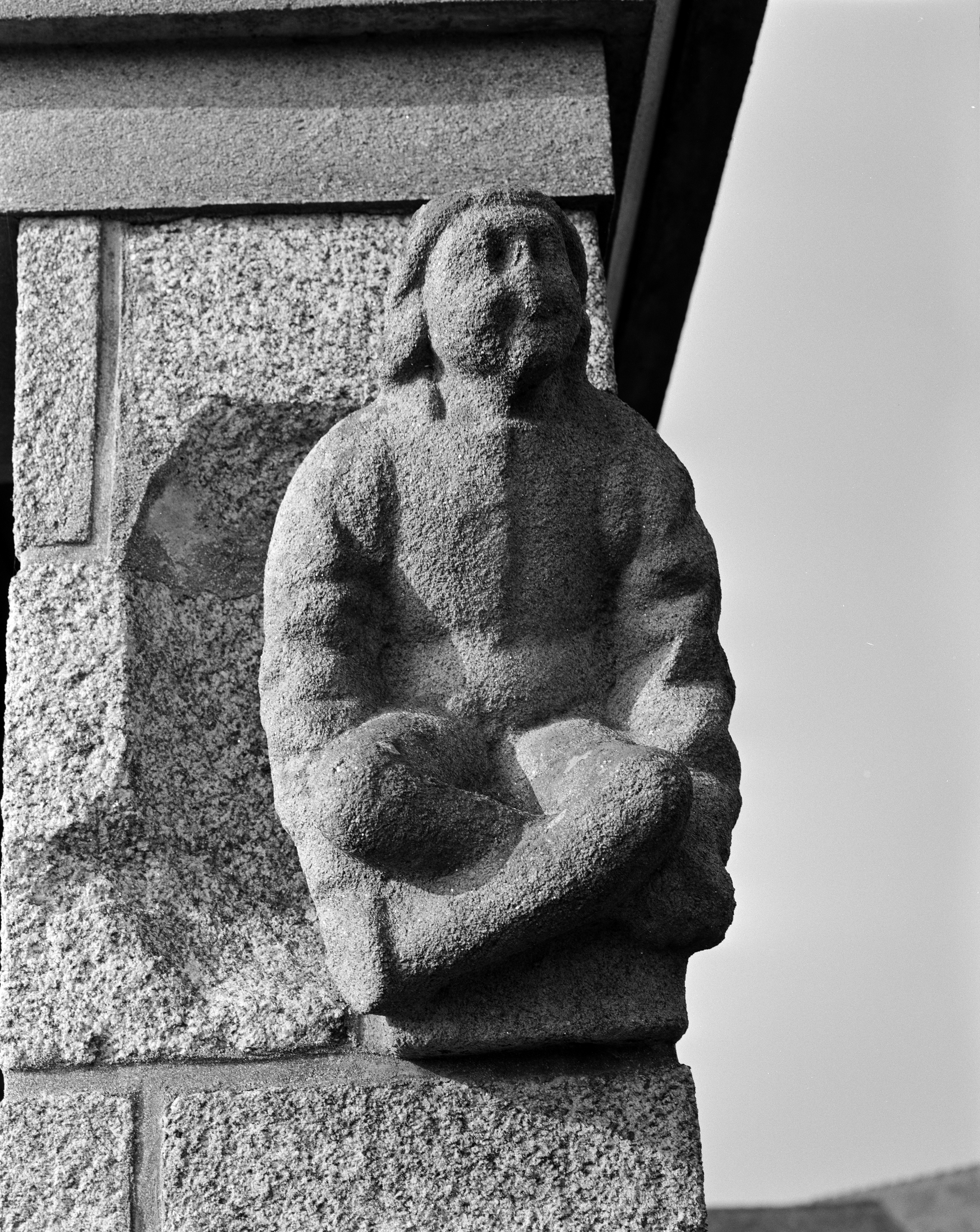 Détail d'une sculpture ornant un rampant de l'ancienne chapelle.Immatriculation