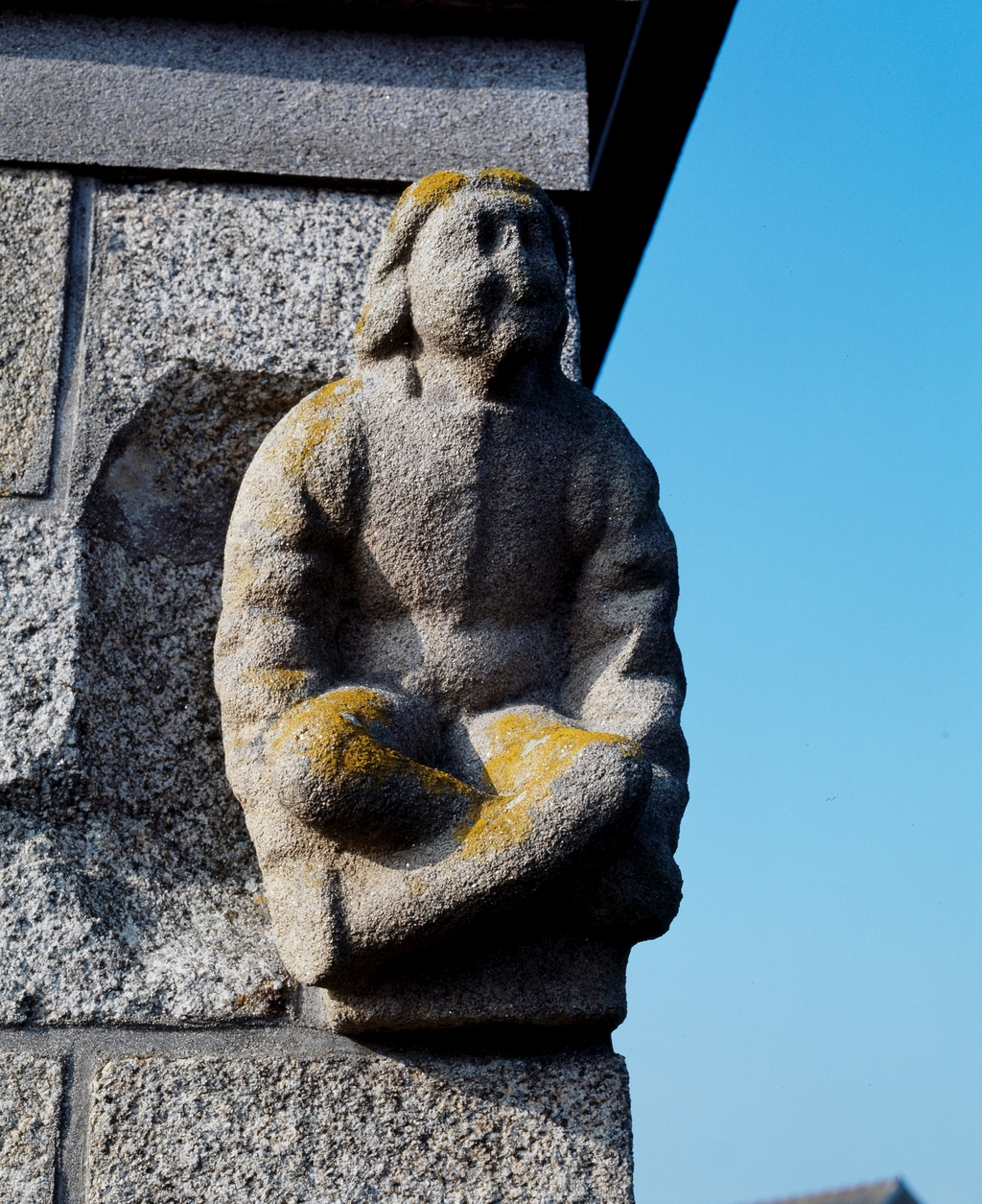 Détail d'une sculpture ornant un rampant de l'ancienne chapelle.Immatriculation