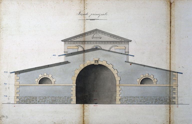 Agrandissement de l'abattoir par Edmond Bassac. Construction d'un bâtiment pour l'échaudoir. Elévation ouest datée 1891. AM Vannes 1M197.Immatriculation