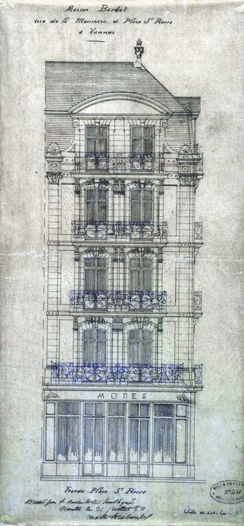 Immeuble Bardet, élévation façade place Saint-Pierre par Mathurin Fraboulet, 1880. AM Vannes fonds Fraboulet.Immatriculation