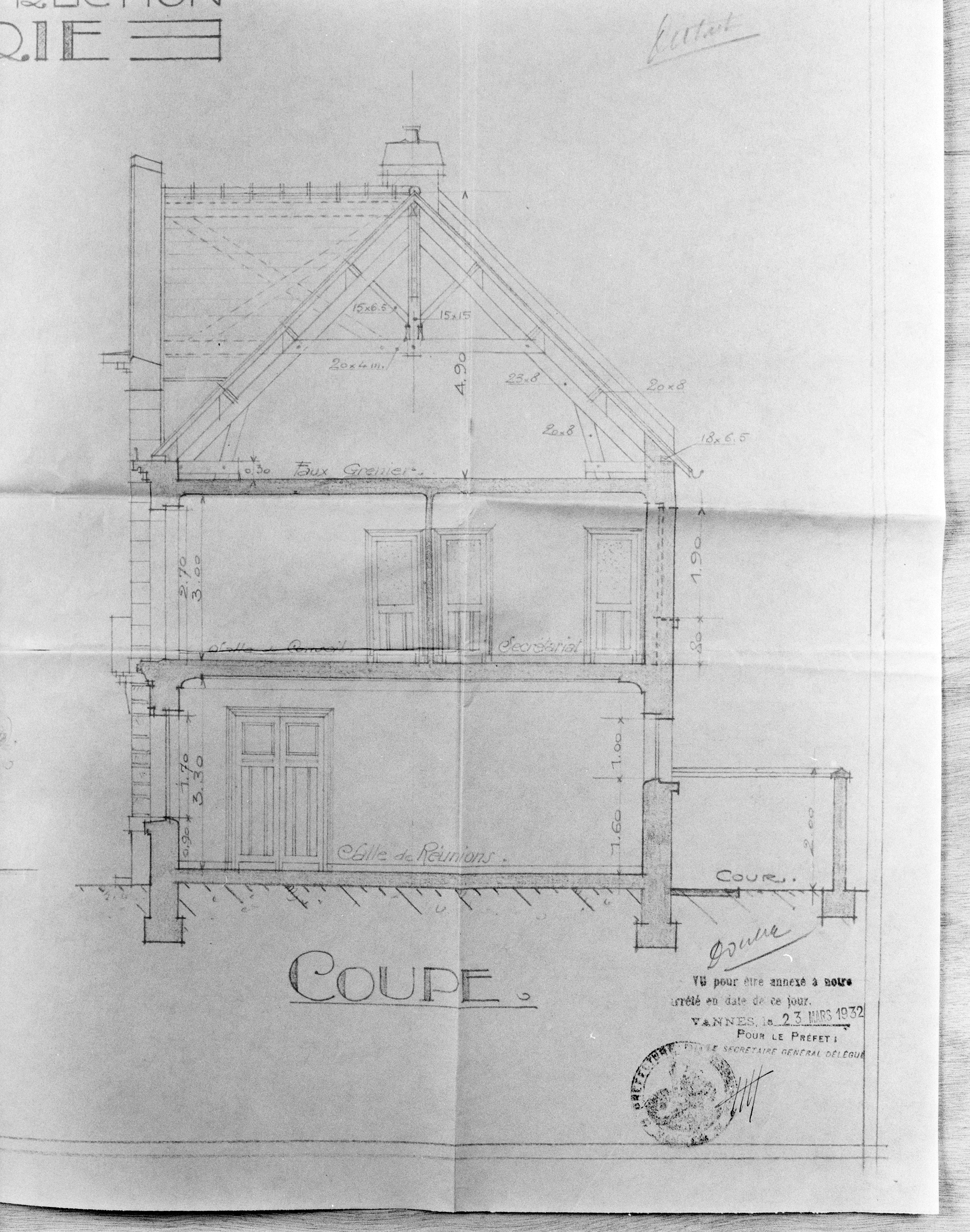 Projet de construction d'une mairie, dressé par L. Dutartre, architecte à Lorient en 1932. Coupe.Immatriculation