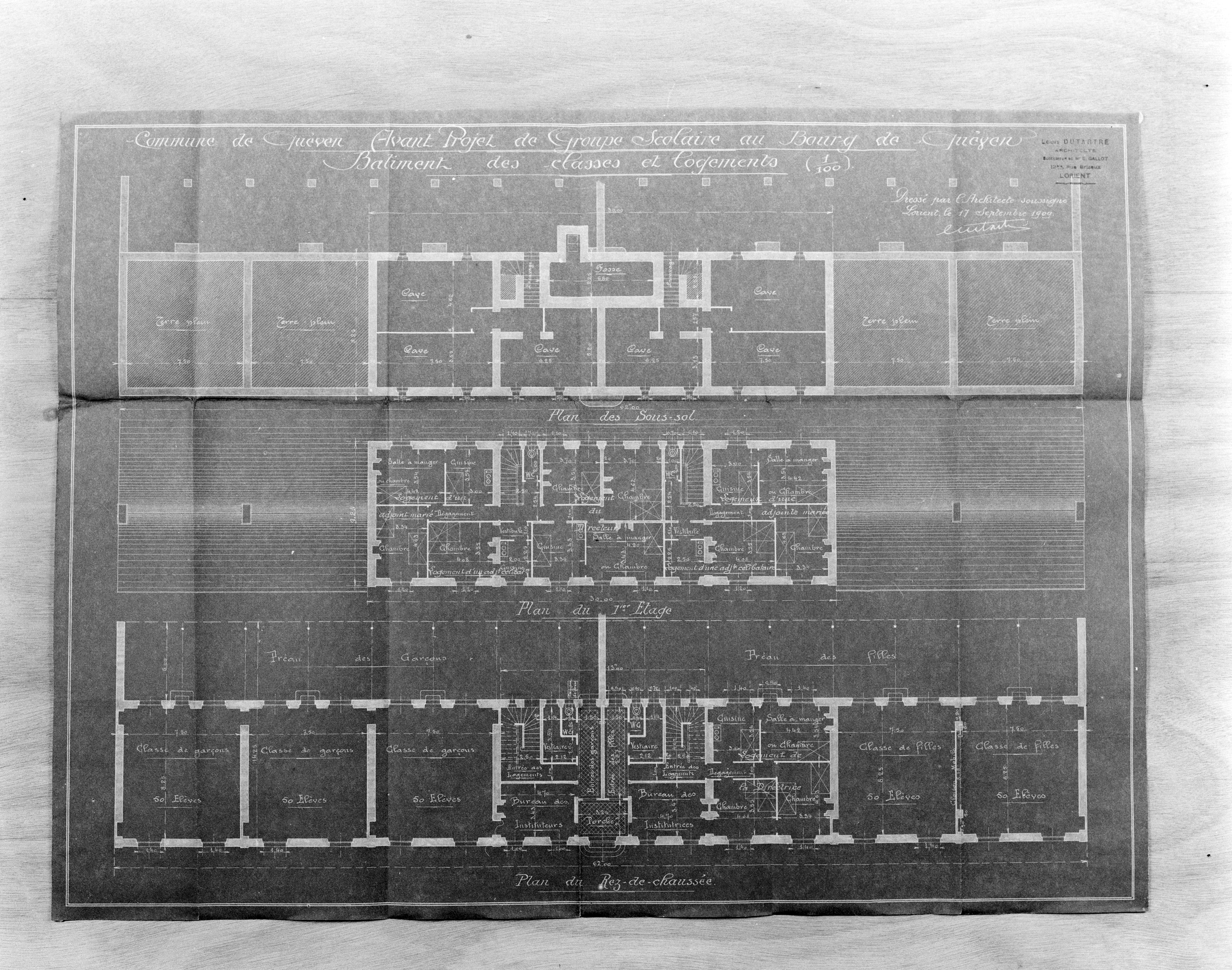 Avant-projet du groupe scolaire au bourg de Quéven, rue Jean Jaurès, dressé par l'architecte soussigné Louis Dutartre, Lorient le 17 septembre 1909 : plan des sous-sol ; plan du 1er étage ; plan du rez-de-chaussée.Immatriculation