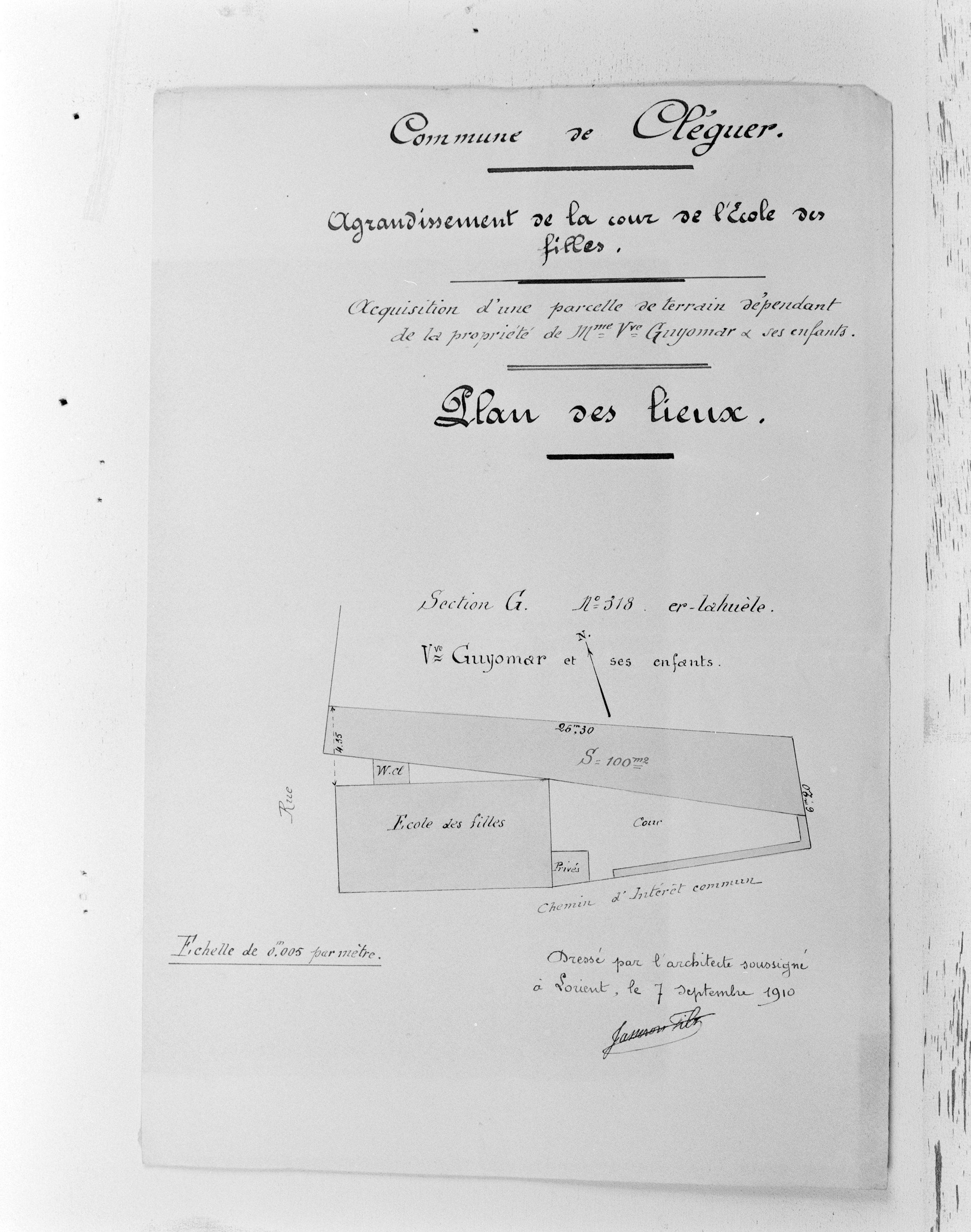 Agrandissement de la cour d'une école de filles, établi par l'architecte Jasseron Fils à Lorient le 7 septembre 1910.Immatriculation