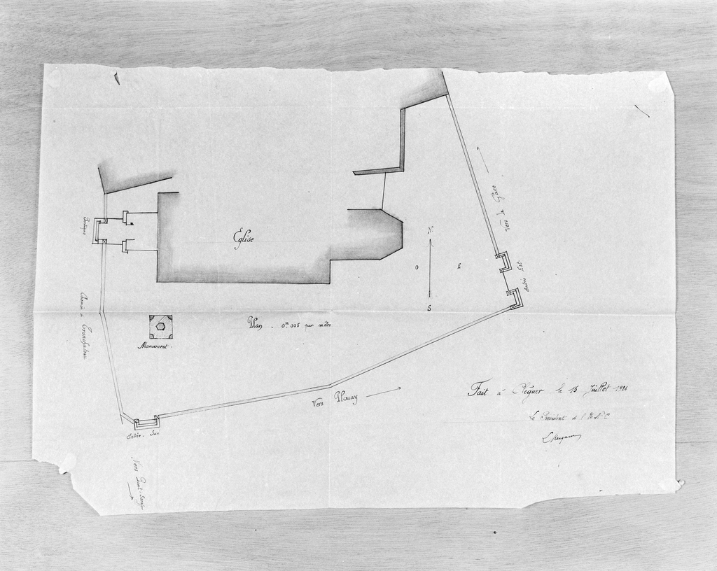 Plan au sol de situation du monument aux morts par rapport à l'église paroissiale.Immatriculation
