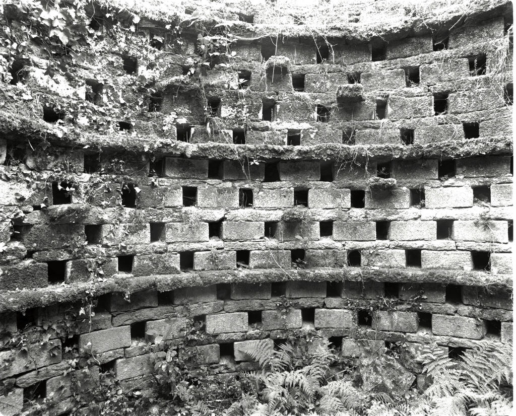 Pigeonnier, détail des trous de boulins.Immatriculation