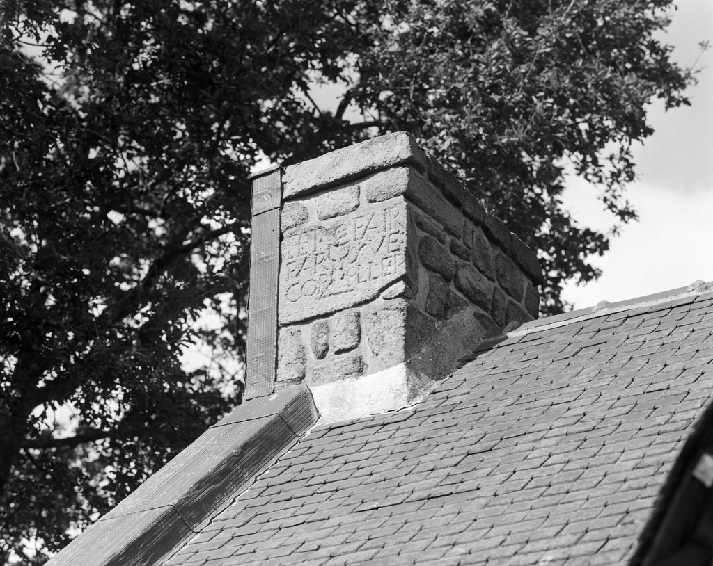 Kerlen, ferme, maison de gauche, souche de cheminée ouest portant l'inscription : FET FAIR PAR YVES COROLLER.Immatriculation