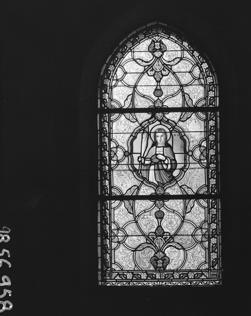Verrière de la nef : sainte Barbe.Immatriculation