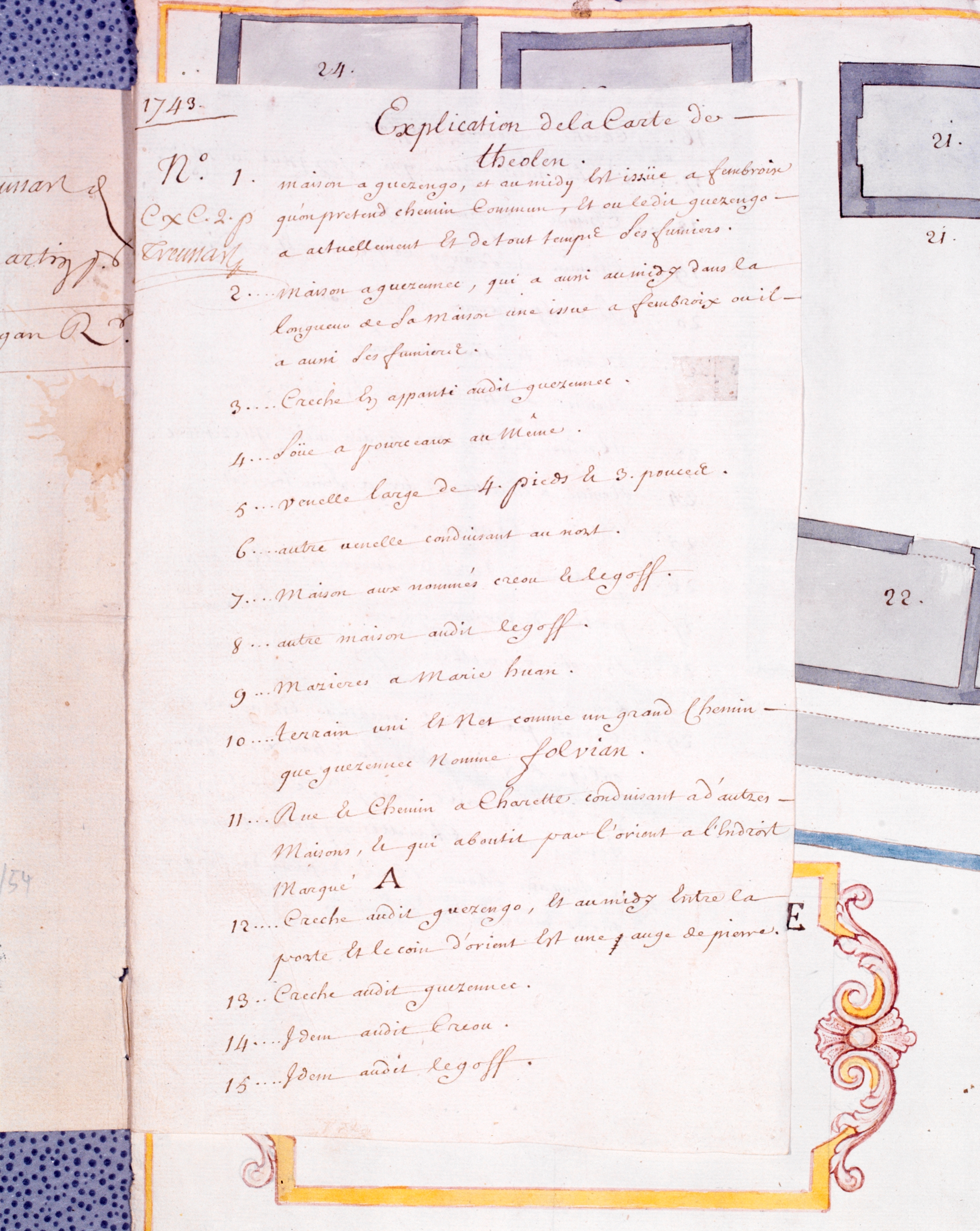 Plan du village de Théolen daté de 1743, légende 1/2.Immatriculation