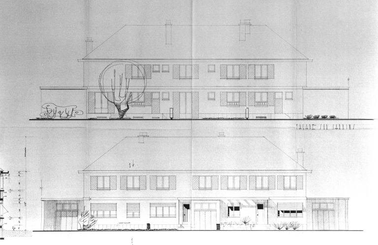 Élévations antérieure et postérieure, dessin, par Henry Auffret et J. Vaudeleau, 1957, (A. C. Rennes)Immatriculation