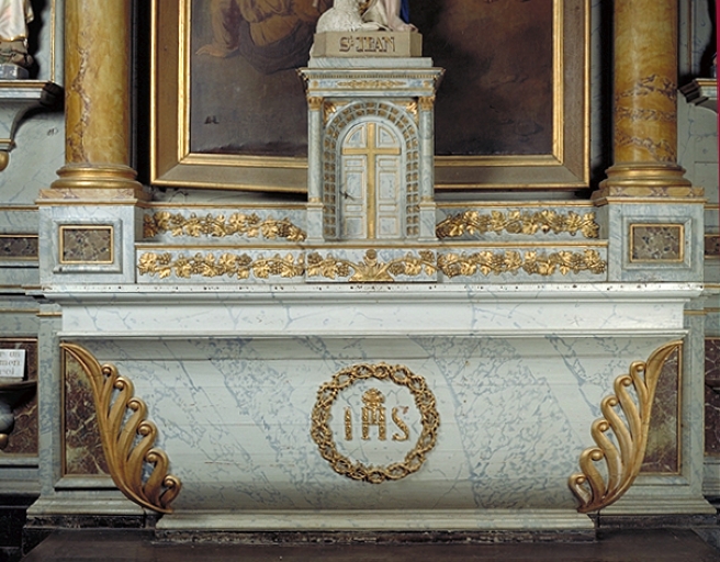 Ensemble de l'autel secondaire sud (autel, tabernacle, 2 gradins, retable),