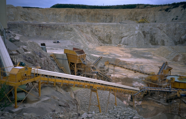 Vue générale de l'excavation et des équipements de traitement des matériaux extraits dont les bandes transporteuses situées au premier planImmatriculation