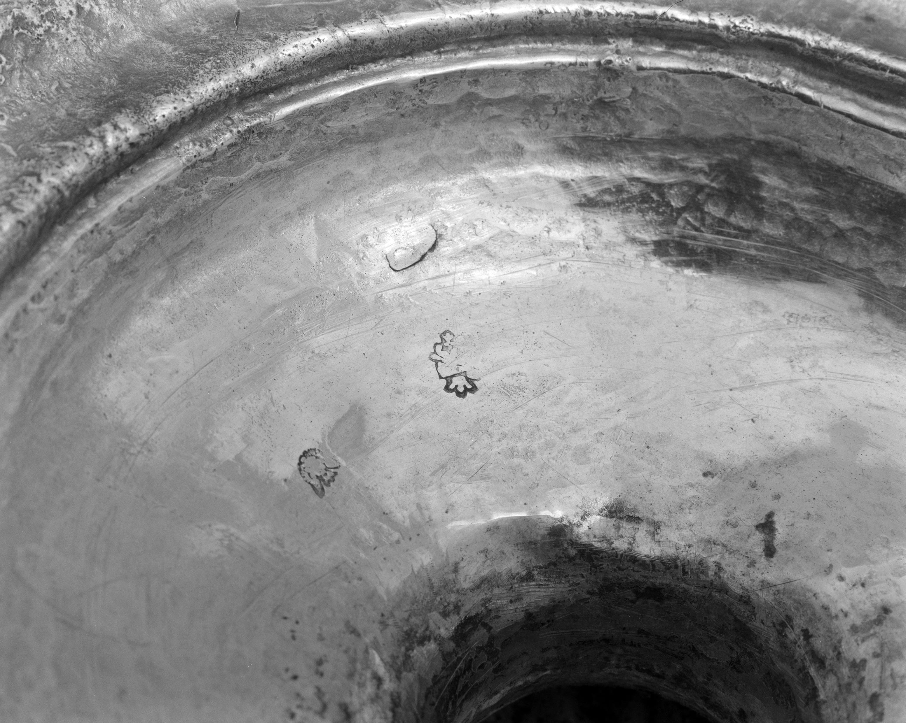 Vue de détail du poinçon sous le pied du calice.Immatriculation
