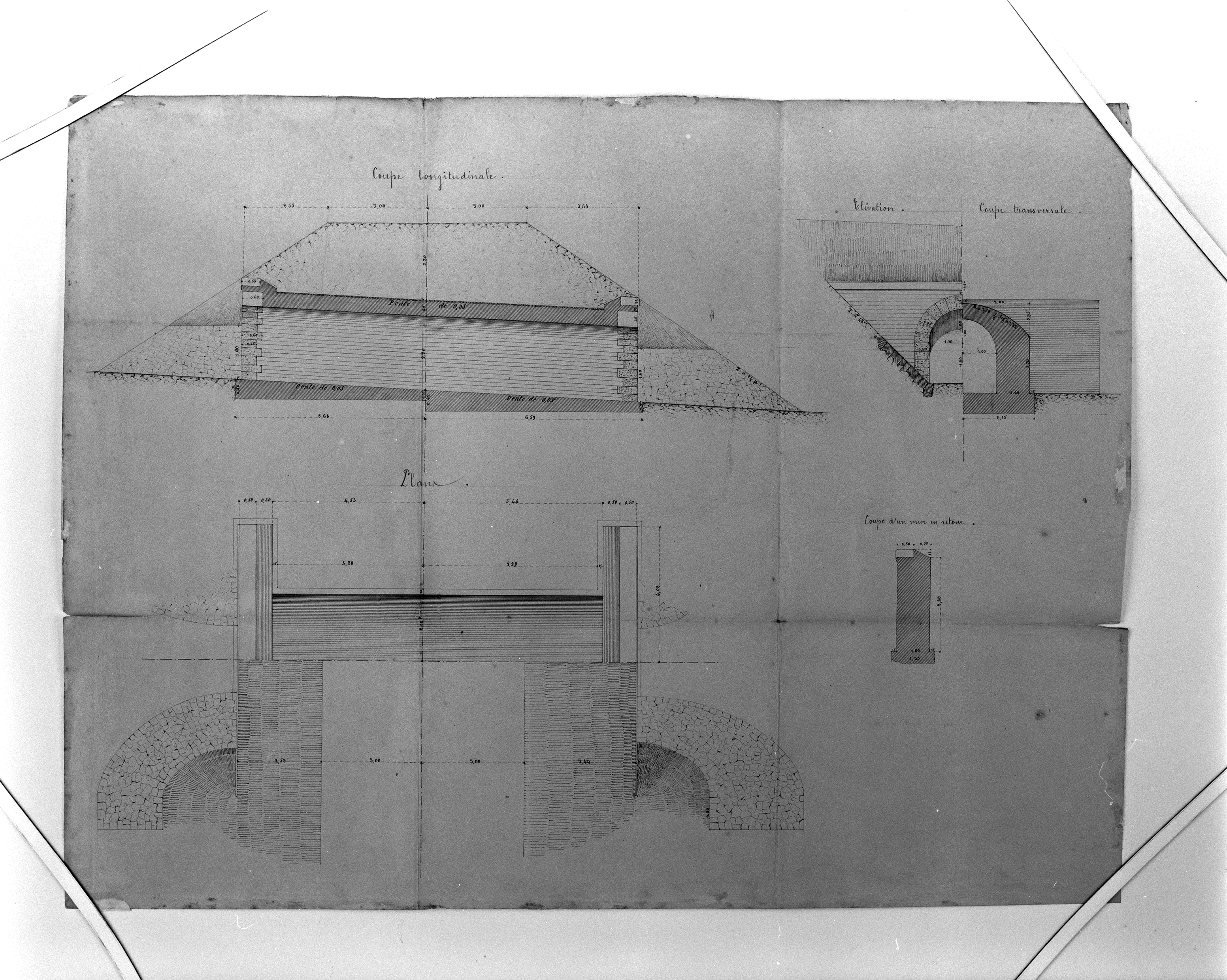 Projet de construction de la partie comprise dans la traversée. Dessin de Ponceau 1869. Coupes longitudinale, transversale, élévation, plan.Immatriculation