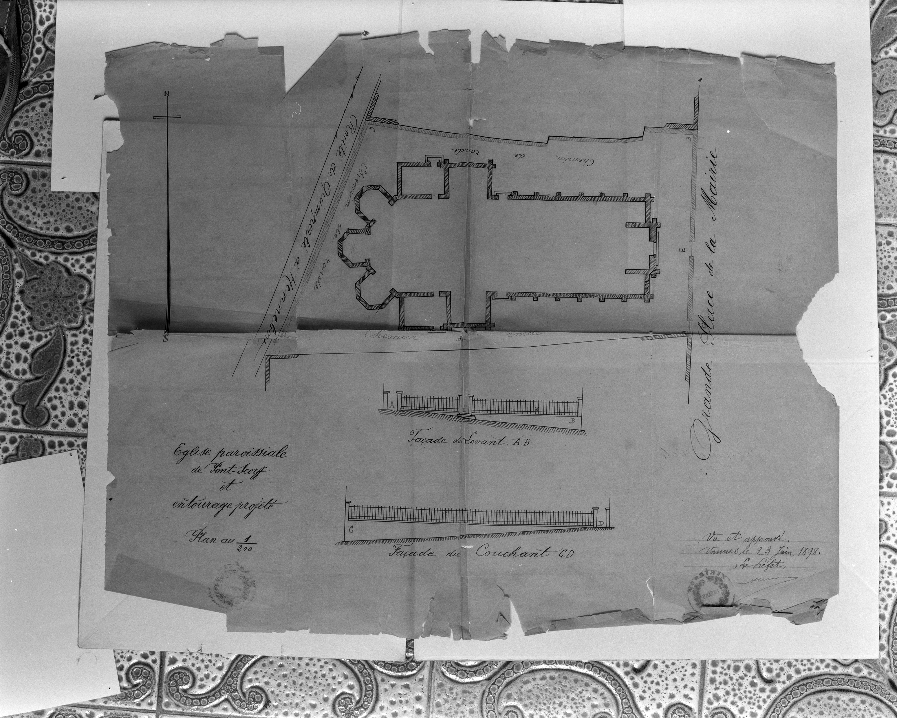 Projet d'une l'église paroissiale de Pont-Scorff, plan au sol et entourage projeté, 1898.Immatriculation