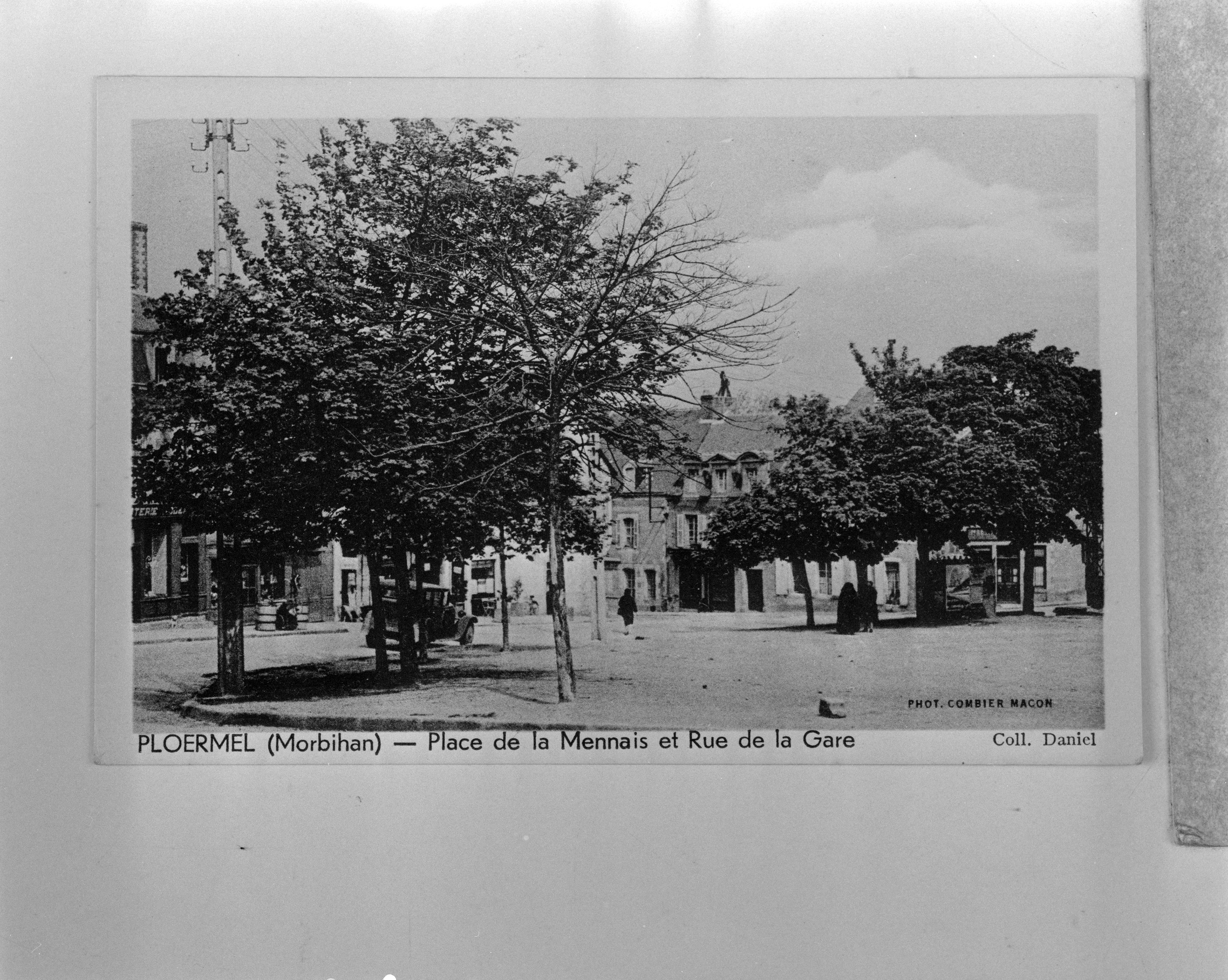 PLOËRMEL (Morbihan) - Place de la Mennais et Rue de la Gare. Carte postale, [s. l. ; Combier, Macon, phot. ; 2e quart 20e siècle].