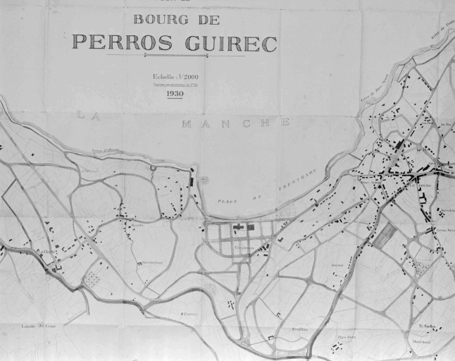 Plan régulateur pour le bourg de Perros-Guirrec par Gagnière géomètre, 1930 [réalisé en partie], éch. 1/20000e, encre et lavis de couleur sur papier cartonné.Immatriculation