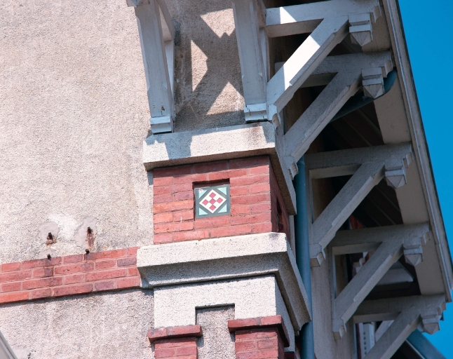 Détail d'un carreau de céramique décoratif (motif géométrique).Immatriculation