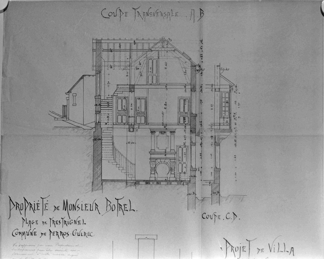 Propriété de M. Botrel, plage de Trestrignel, projet de villa réalisé, coupe transversale, encre sur calque, par P. Botrel vers 1902Immatriculation