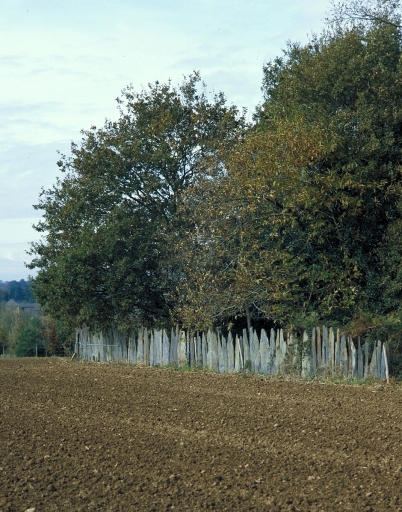Paysage et clôture en palis de schiste le long d'un champ, à la TresnelaisImmatriculation