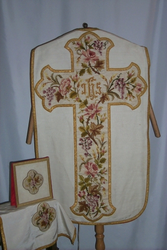 Ornement blanc 1 : chasuble, étole, bourse de corporal, voile de calice,