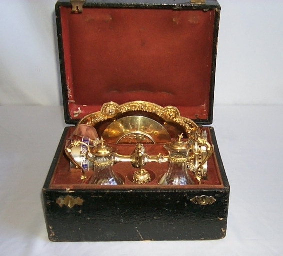 Chapelle : calice, patène, plateau à burettes, 2 burettes, clochette,