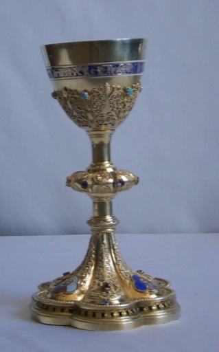 Chapelle : calice, patène, plateau à burettes, 2 burettes, clochette,