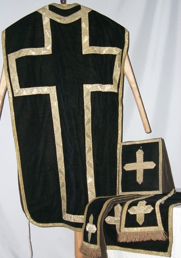 Ornement noir 1 : chasuble, étole, manipule, bourse du corporal, voile du calice,