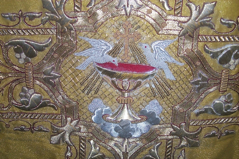 Ornement doré 1 : chasuble, manipule, étole, voile de calice,