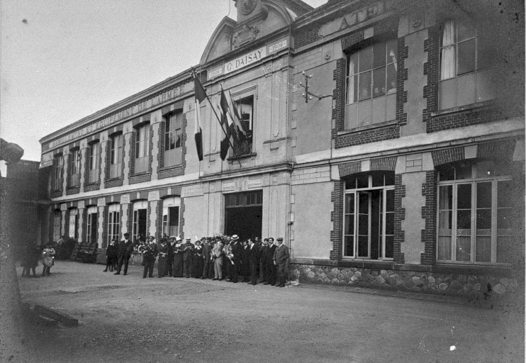 Usine d'équipement militaire Daisay : photographie réalisée en souvenir de la visite des officiers russes, le 28 mai 1914.Immatriculation