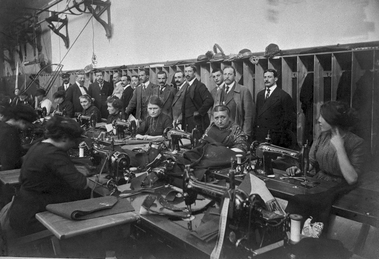 Usine d'équipement militaire Daisay : photographie réalisée en souvenir de la visite des officiers russes, le 28 mai 1914 (atelier de confection).Immatriculation