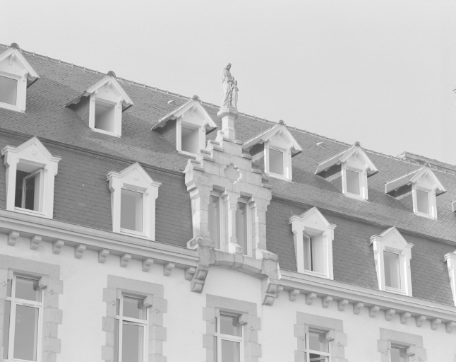 Détail des baies jumelées surmontées de la statue de sainte-Anne.Immatriculation