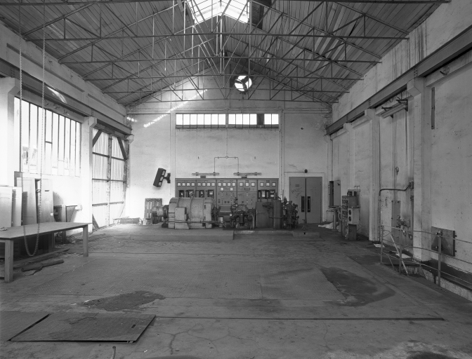 Salle des machines, vue générale intérieure avec, au fond, le tableau électrique et le turbo-alternateur. Cette salle se distingue par son plafond lambrissé en bois, sa charpente métallique et son pont roulant.Immatriculation