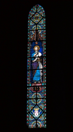 Ensemble des 3 verrières à personnages des baies 0 à 2 : saint Jean-Baptiste, saint Pierre, saint Paul,