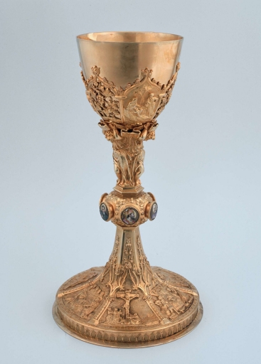 Chapelle et sa boîte : calice, patène, 2 burettes et leur plateau,