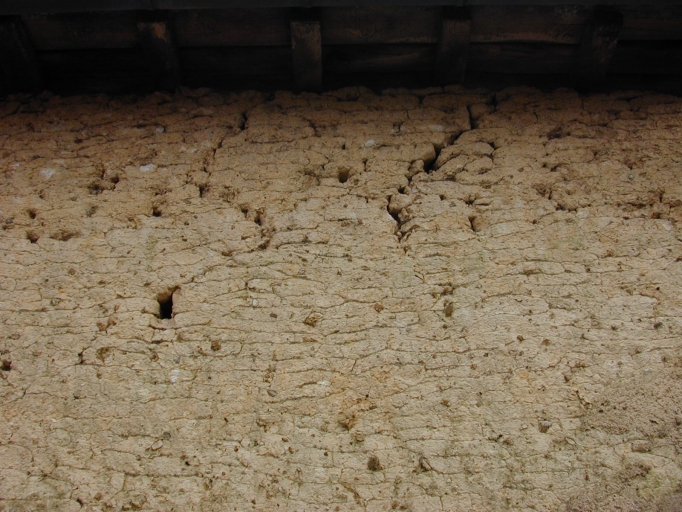 Détail : la façade nord de l'étable en terre présente une technique de construction par 'petits paquets'Immatriculation